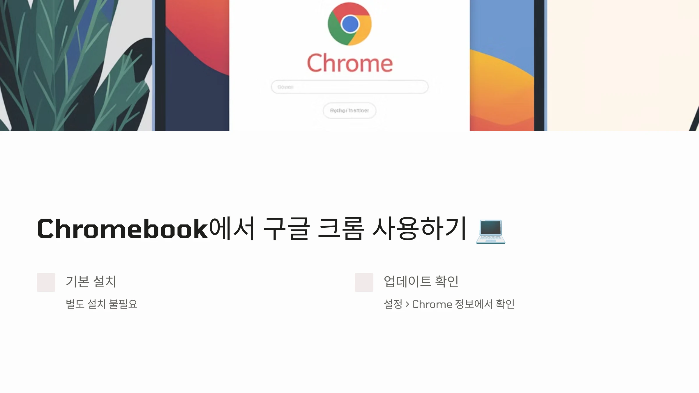 Chromebook에는 기본적으로 크롬이 탑재되어 있어 별도의 설치가 필요 없습니다. 다만 브라우저 최신 상태를 확인하려면 설정 > Chrome 정보에서 업데이트 여부를 확인하시기 바랍니다.