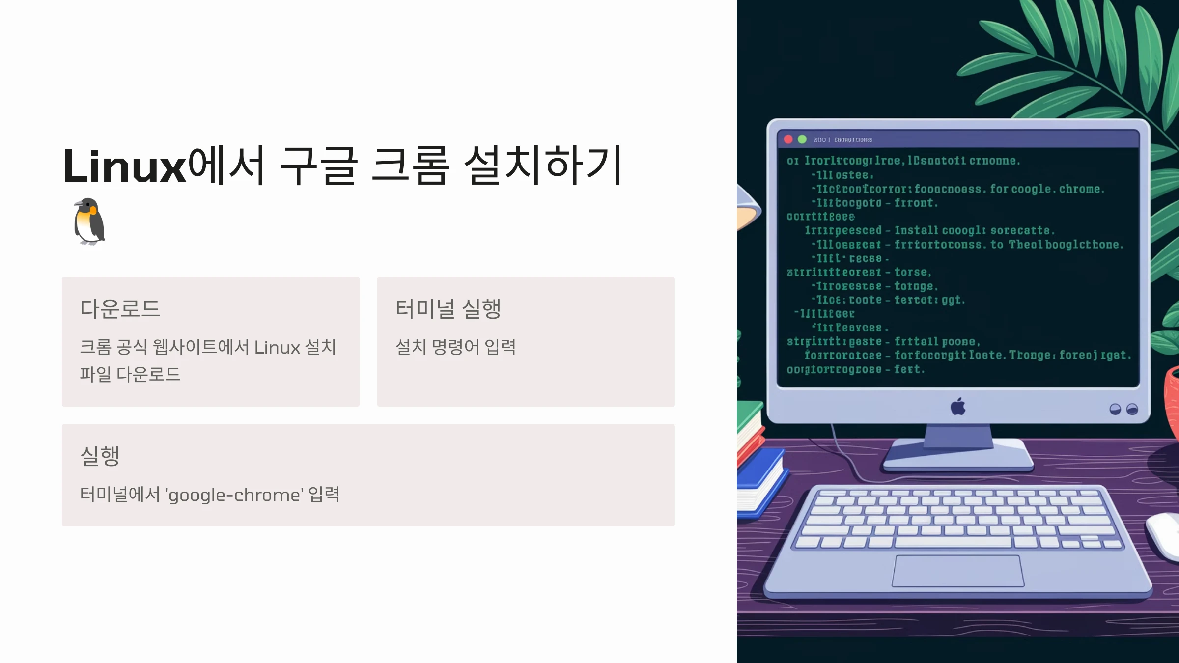 sudo dpkg -i google-chrome-stable_current_amd64.deb sudo apt-get install -f - 설치가 끝나면 터미널에서 google-chrome 명령으로 실행할 수 있습니다.