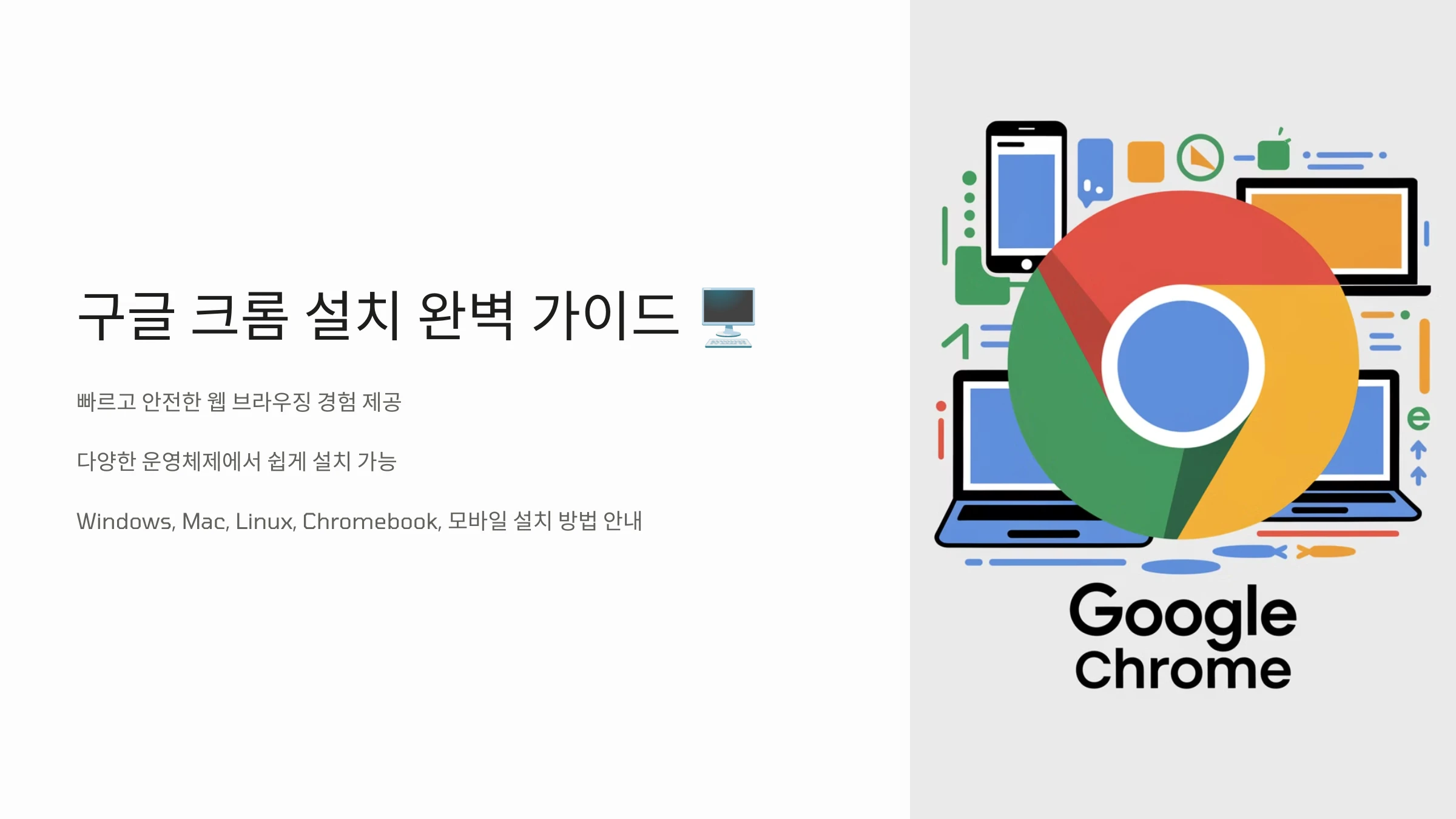 구글 크롬은 빠르고 안정적인 웹 탐색을 제공하는 대표적인 브라우저입니다. 여러 운영체제에서 손쉽게 설치할 수 있으며, 이 글에서는 Windows, Mac, Linux, Chromebook뿐만 아니라 모바일(Android, iOS) 환경에서 크롬을 내려받아 설치하는 과정을 차근차근 안내합니다. 또한 설치 전 확인해야 할 시스템 요구사항, 설치 중 흔히 겪는 문제와 해결책, 기본 브라우저 지정 방법, 그리고 크롬을 사용할 때의 주요 장점까지 정리해 드립니다.