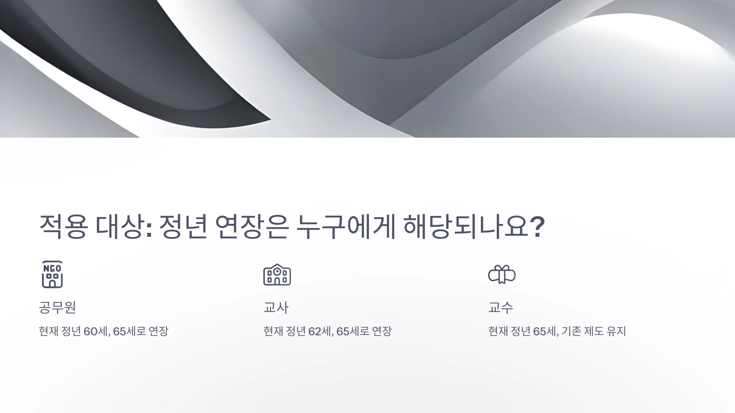 우선적으로 공공부문에서 정년 연장이 적용될 가능성이 큽니다. 공공부문은 제도 변경의 영향 범위를 비교적 예측하기 쉬워 시범적 적용 대상이 되기 쉽습니다.