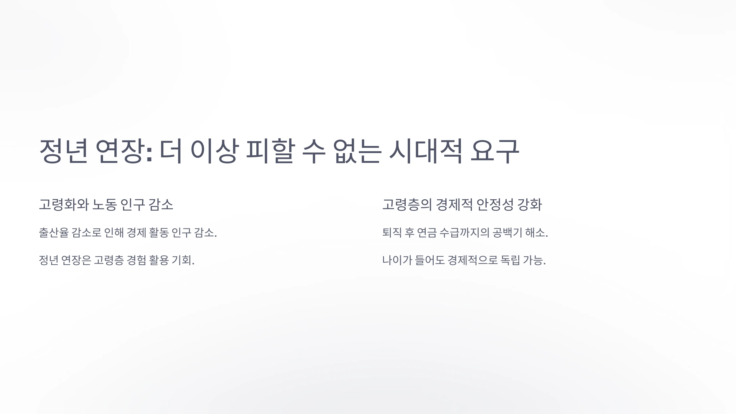 최근 인구구조 변화로 생산가능인구가 줄어들고 있습니다. 정년을 연장하면 풍부한 경험을 지닌 고령 근로자의 노동 참여를 유지할 수 있어, 노동력 공백을 일부 보완할 수 있습니다. - 고령층의 경제적 불안 해소