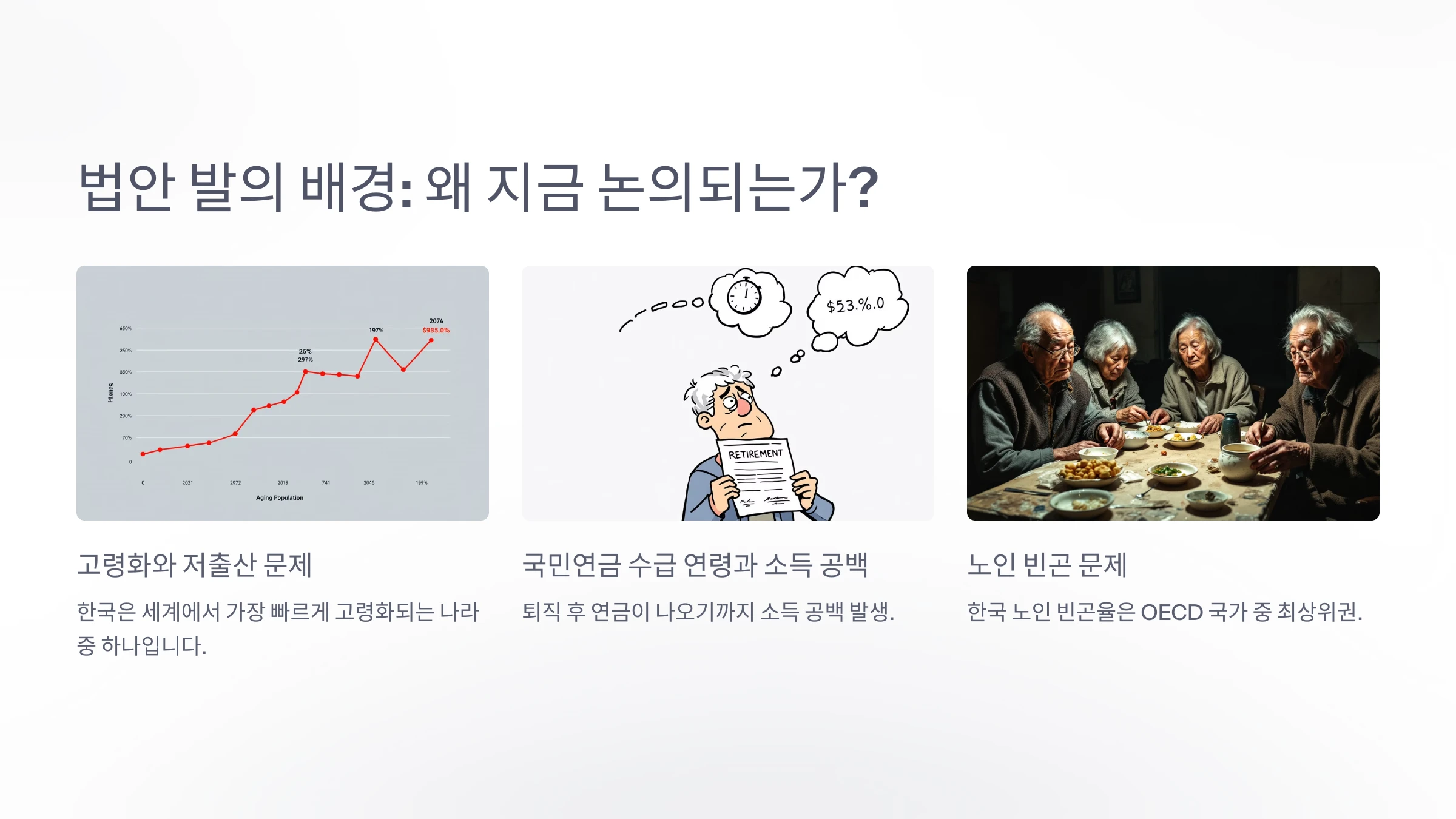 정년 연장 법안은 갑작스러운 제안이 아닙니다. 장기간 누적된 인구·사회적 문제들이 이 논의를 촉발했습니다.