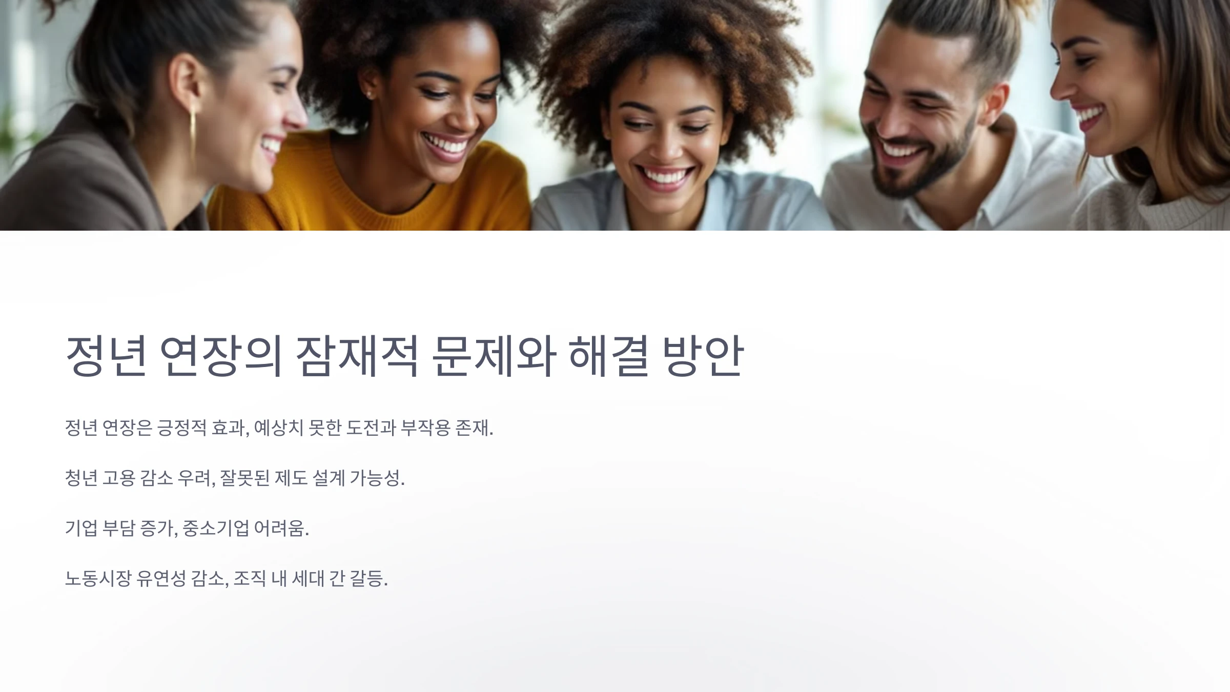 - 직무별·업종별 차등 적용: 고령 근로자의 전문성을 살리고 청년층의 진입을 막지 않도록 직무별로 정년 연장 범위를 조정할 필요가 있습니다.