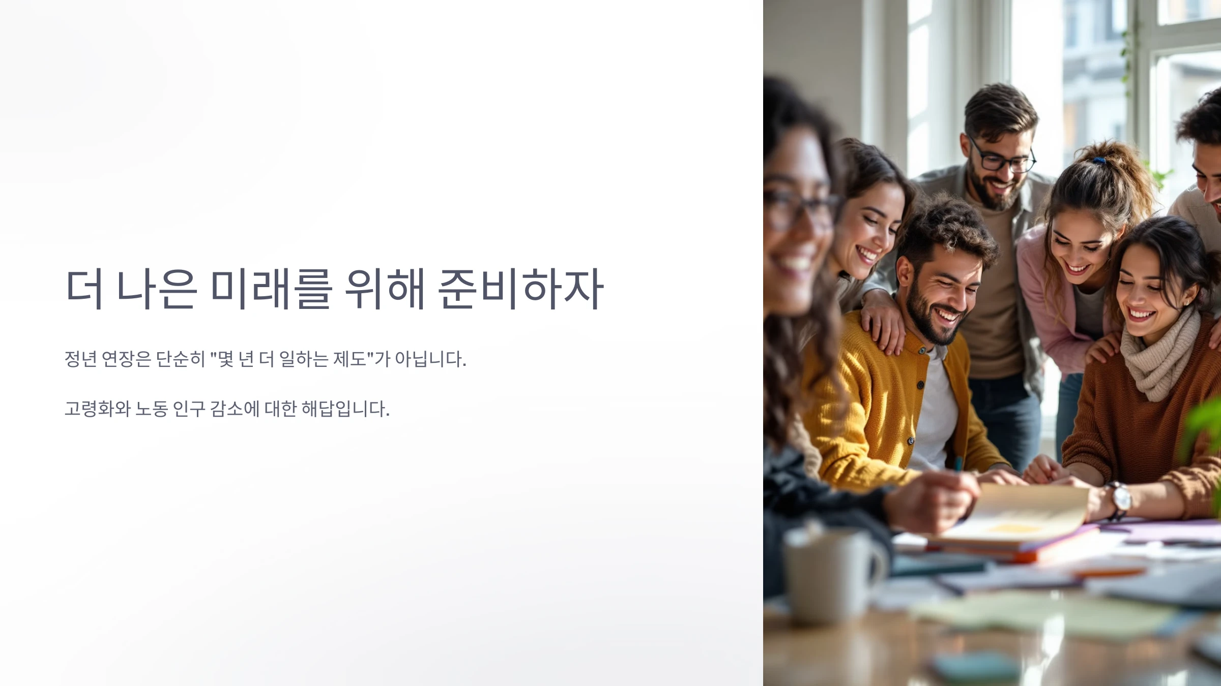 정년 연장은 단순히 근로 가능 연령을 늘리는 문제가 아닙니다. 이는 노동시장 구조와 사회안전망을 재설계해야 하는 중요한 전환점입니다.
