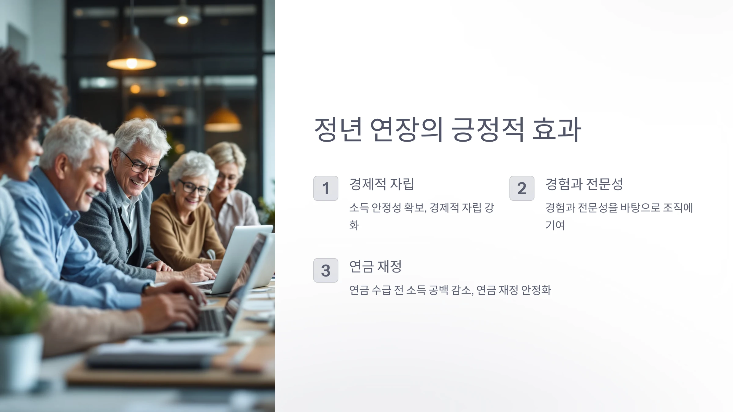 오랜 기간 쌓아온 경력과 전문성은 조직에 큰 자산입니다. 정년 연장은 이러한 인적 자원을 더 오래 활용할 수 있게 하여 조직의 경쟁력 유지에 기여할 수 있습니다. - 연금 재정에 대한 긍정적 영향