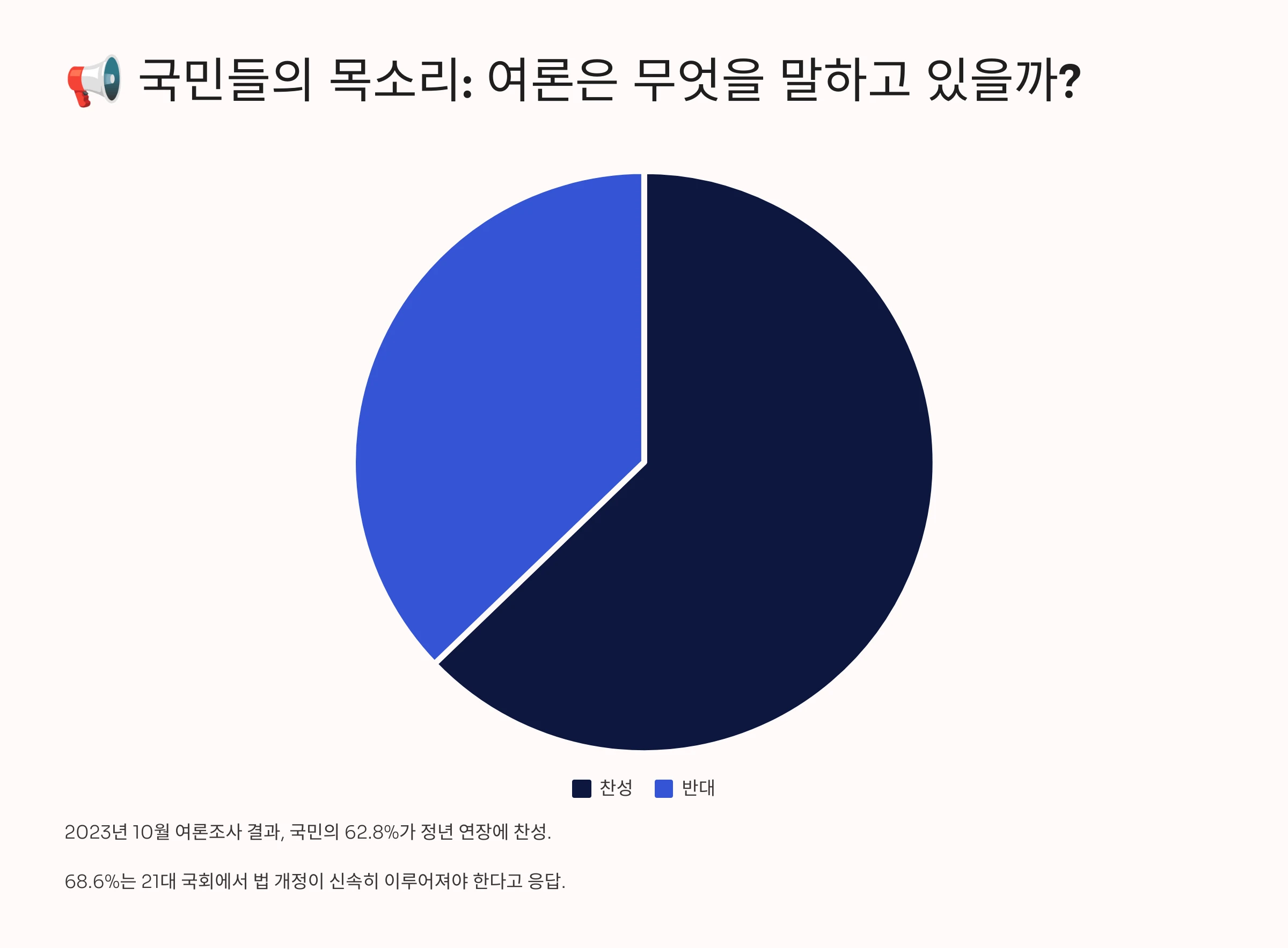 - 2023년 10월 조사에서는 국민의 62.8%가 정년 연장에 찬성한다고 응답했습니다.