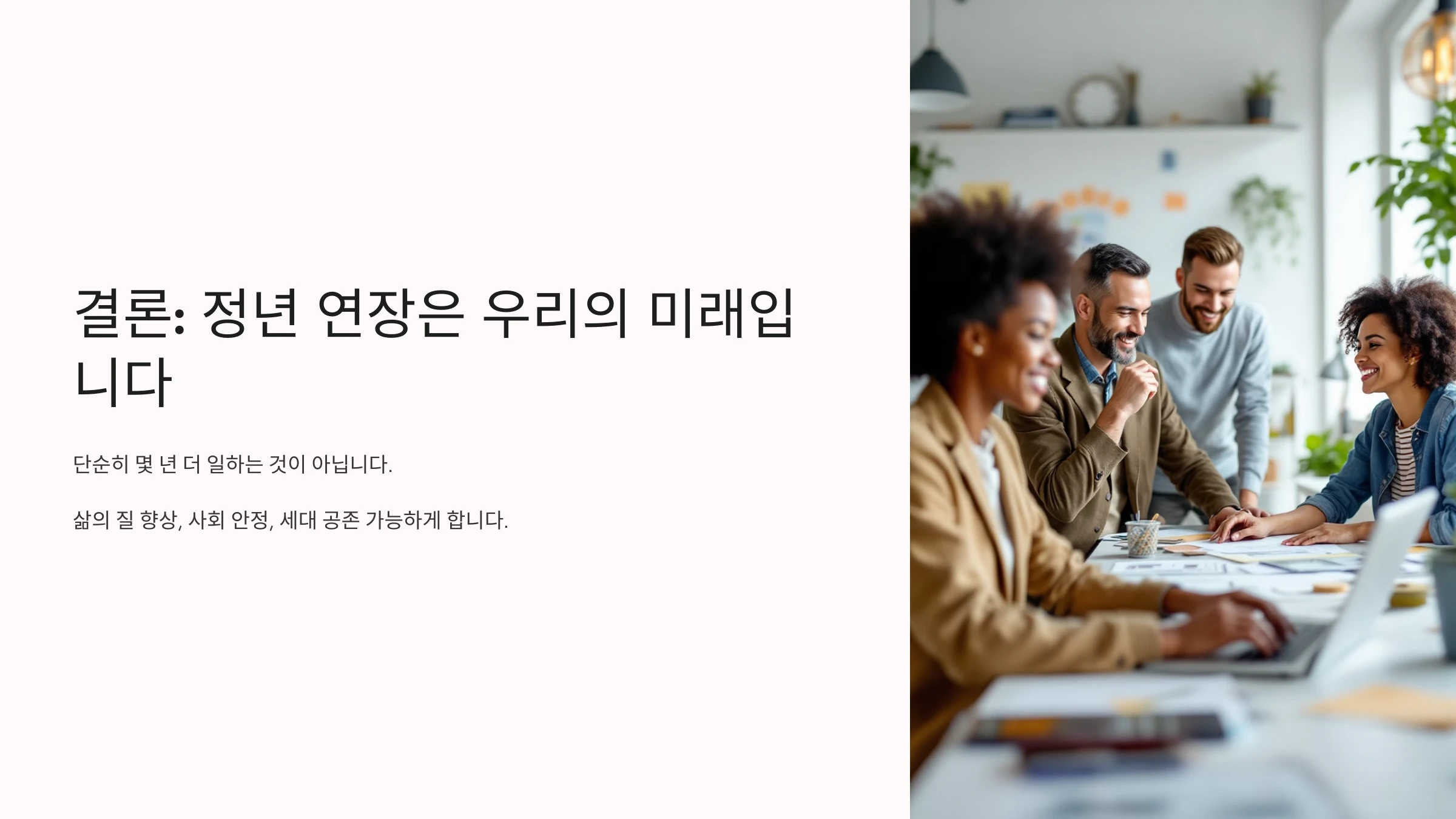정년 연장은 단순히 근로 연한을 늘리는 정책이 아닙니다. 이는 삶의 안정과 세대 간 조화를 돕는 사회적 장치이기도 합니다.
