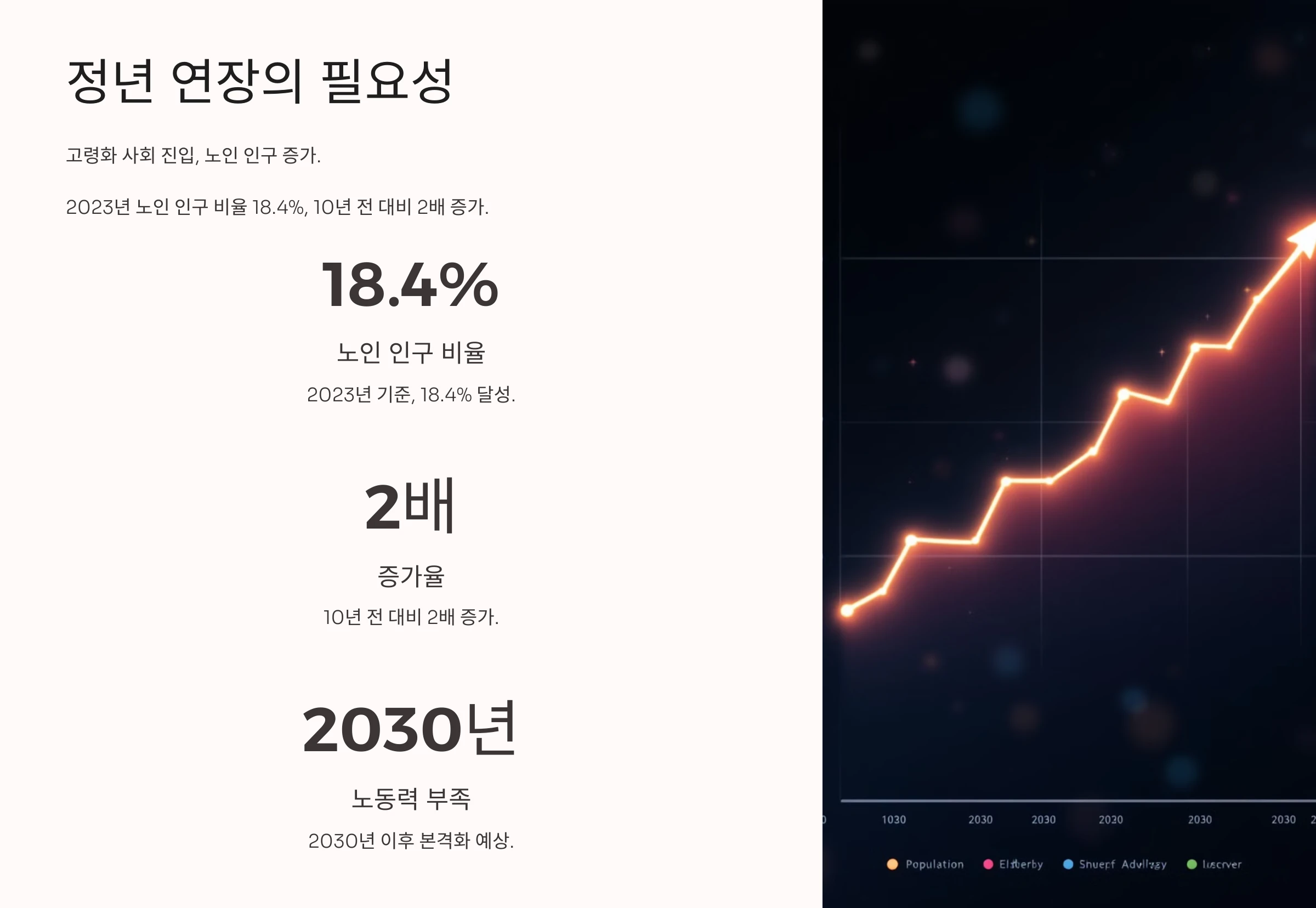- 아울러 출산율 저하가 겹치면서 2030년대에는 노동력 부족 문제가 본격화될 가능성이 큽니다.