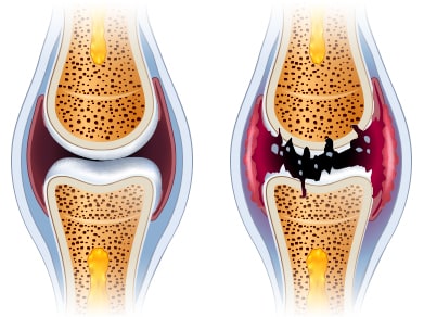 연골이 닳으면서 관절 사이 간격이 줄어들고 통증과 강직이 나타납니다. 초기에는 소염진통제나 연골 보호제, 휴식과 적절한 운동으로 경과를 관찰하며 보존적 치료를 시도합니다. 보존적 치료로 증상이 호전되지 않거나 기능 저하가 심하면 수술적 치료를 고려할 수 있습니다.
