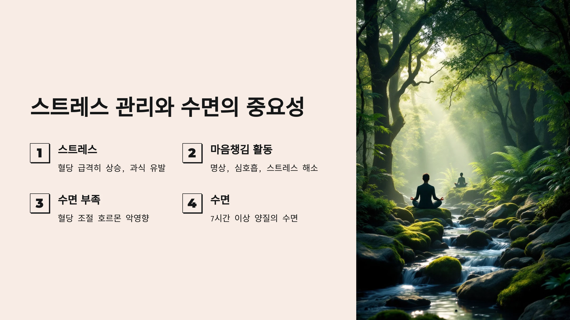 또한 수면 부족은 혈당 조절 호르몬에 부정적 영향을 미칩니다. 매일 7시간 이상의 규칙적인 수면을 확보하는 것이 좋습니다.