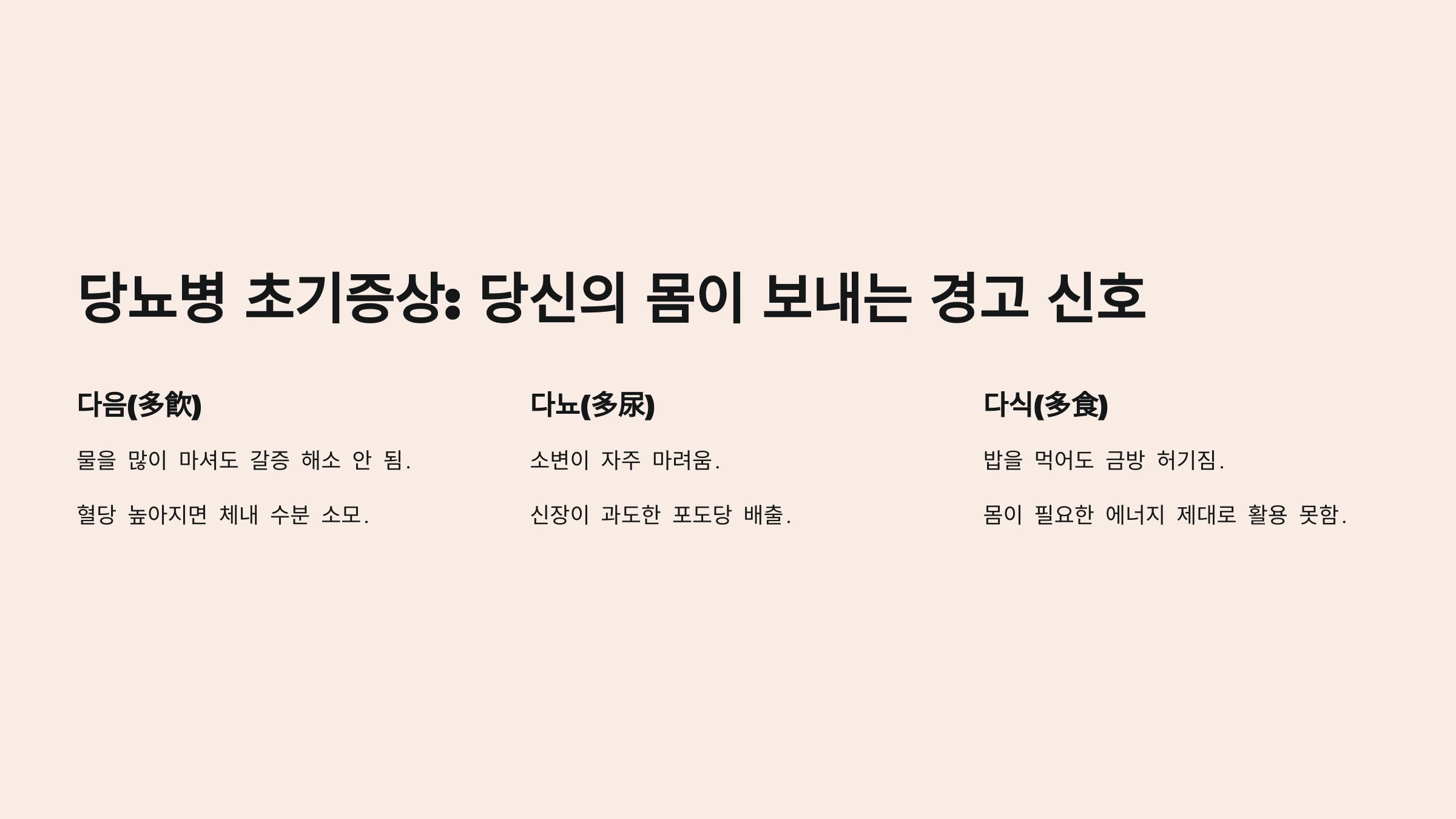 초기에는 증상이 은근하고 산발적이라 놓치기 쉽습니다. 전통적으로 '삼다(三多)'라고 불리는 세 가지 증상을 중심으로 살펴보겠습니다.